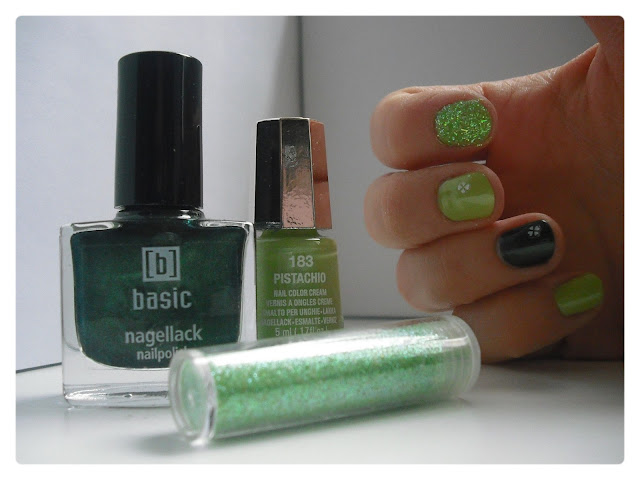 J'ai utilisé le vernis vert de [b] basic, le n° 183 teinte Pistachio de Mavala ainsi que quelques paillettes et pour terminer de petits autocollants trèfle à 4 feuilles.