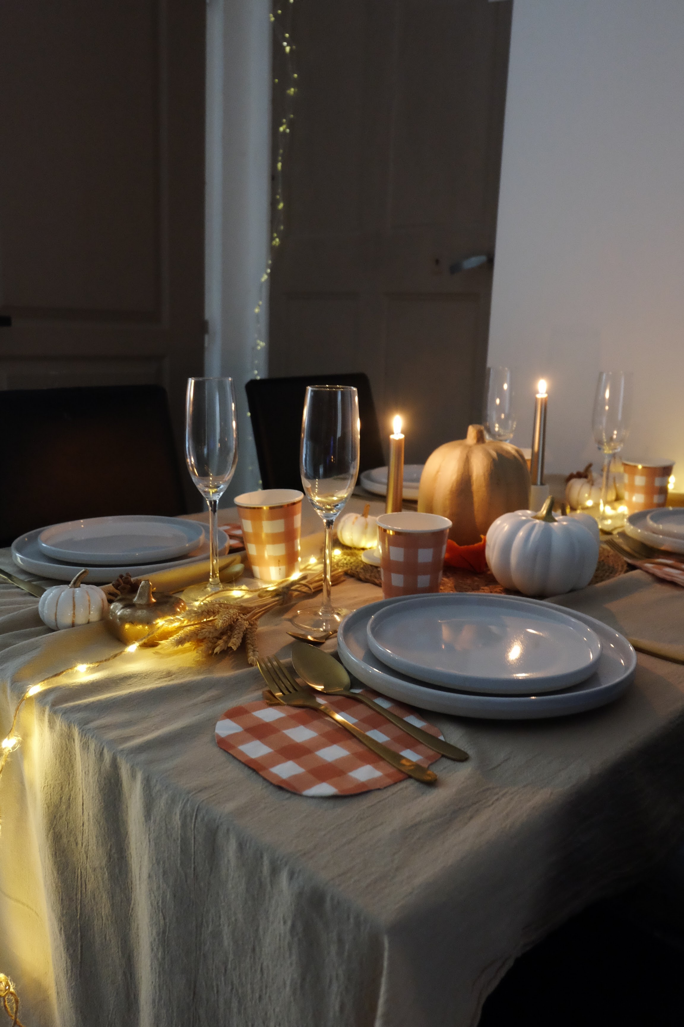 En ce qui concerne la version nuit, j'ai réutilisé les mêmes articles, si ce n'est que j'ai ajouté des chandelles, une guirlande lumineuse, un centre de table en matière naturelle, et du blé séché aussi, pour accentuer le côté automnal. J'avais déjà tout à la maison, mais la décoration Halloween / automnale My Little Day est venue compléter.